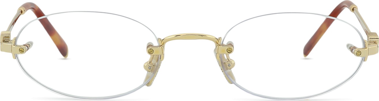 Randlose oder gebohrte Brillen bestehen aus Nasenpads, Scharnieren und Bügeln.